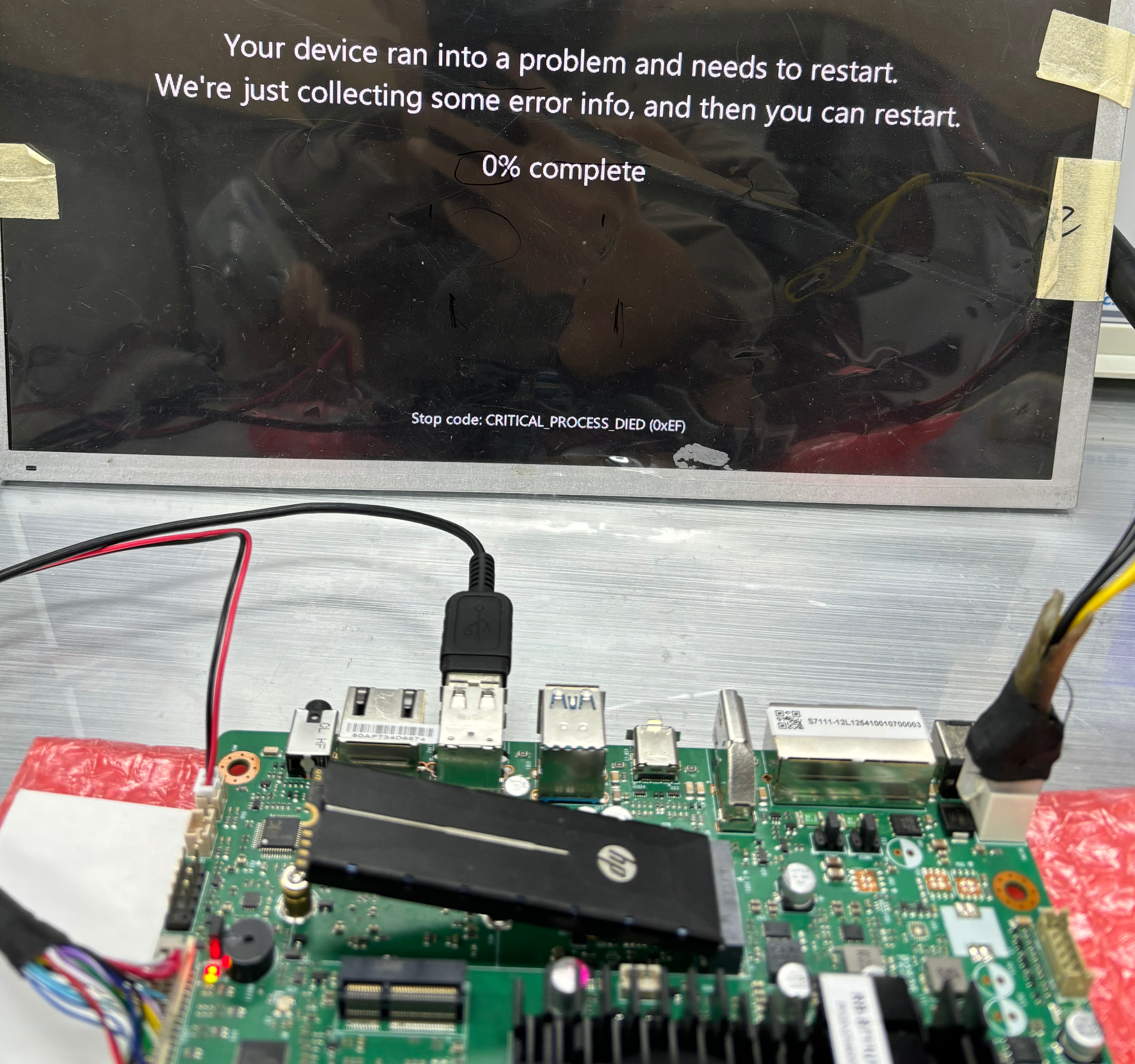 分析可能原因:USB2.0与LAN2 colay后,USB PGND与LAN2 LED PIN破孔短路。上件USB时,LAN2 LED连接的电阻器没有NC掉,导致静电从LAN2 LED进入主板内部线路。实际测试:删除LAN2 LED相关器件后,静电测试+/-2KV可以通过,但是会经常黑屏,停止放电后可以恢复,主板放电速度慢。优化措施:DVT改版优化放电方式,将IO_PGND连接电阻各增加一个,加快放电速度。